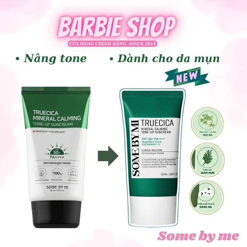 - Kem Chống Nắng Dành Cho Da Mụn Some By Mi Truecica Mineral Calming Tone-up Suncream SPF50+ PA++++ là sản phẩm dành cho da nhạy cảm và da mụn với chỉ số chống nắng lí tưởng cùng công thức thành phần chiết xuất từ thiên nhiên có tác dụng bảo vệ, làm dịu da mụn, ngăn ngừa và hỗ trợ giảm mụn ẩn, mụn viêm, chống lại tia UV gây hại cho da, bảo vệ da khỏi các tác nhân gây hại từ ánh nắng mặt trời và môi trường.