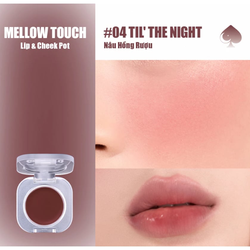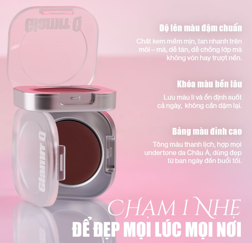 Glamrr Q Mellow Touch Lip & Cheek Pot là sản phẩm trang điểm môi, má và mắt 3-trong-1 với kết cấu mousse blur nhẹ siêu mịn, mang đến lớp finish lì tự nhiên mà vẫn mềm mượt, giữ màu và tệp vào da suốt 12h.