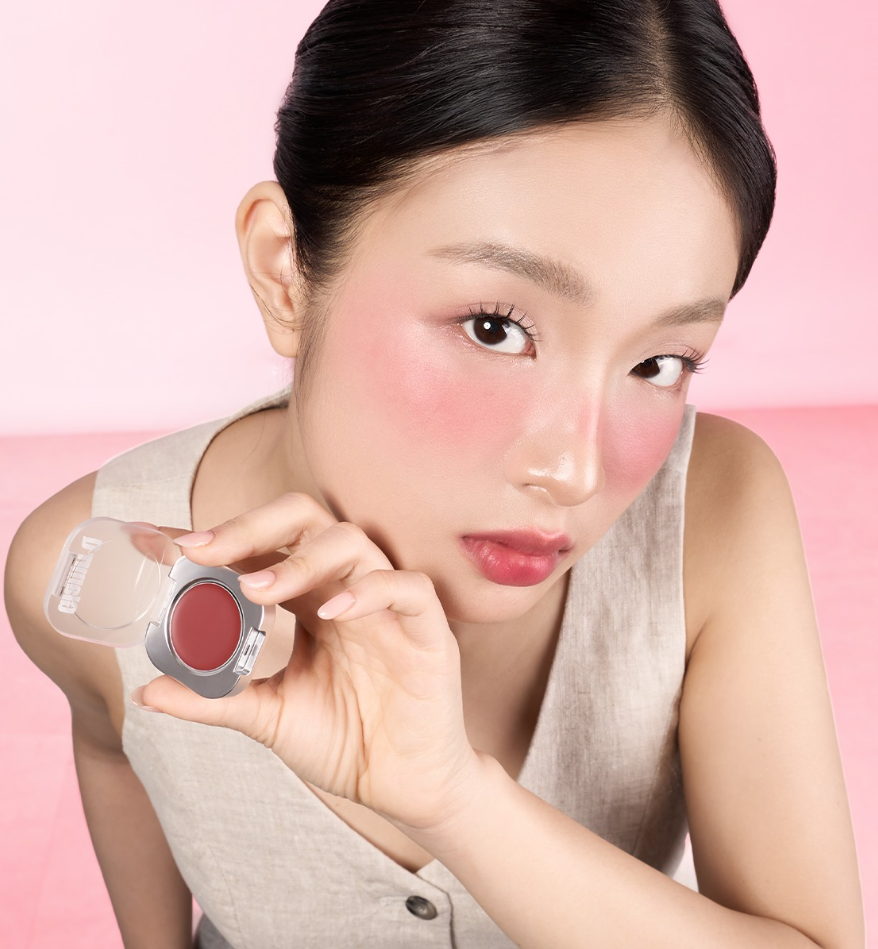 Dùng ngón tay hoặc cọ lấy phấn. Tán đều trên má theo chuyển động tròn để tạo hiệu ứng ửng hồng tự nhiên.