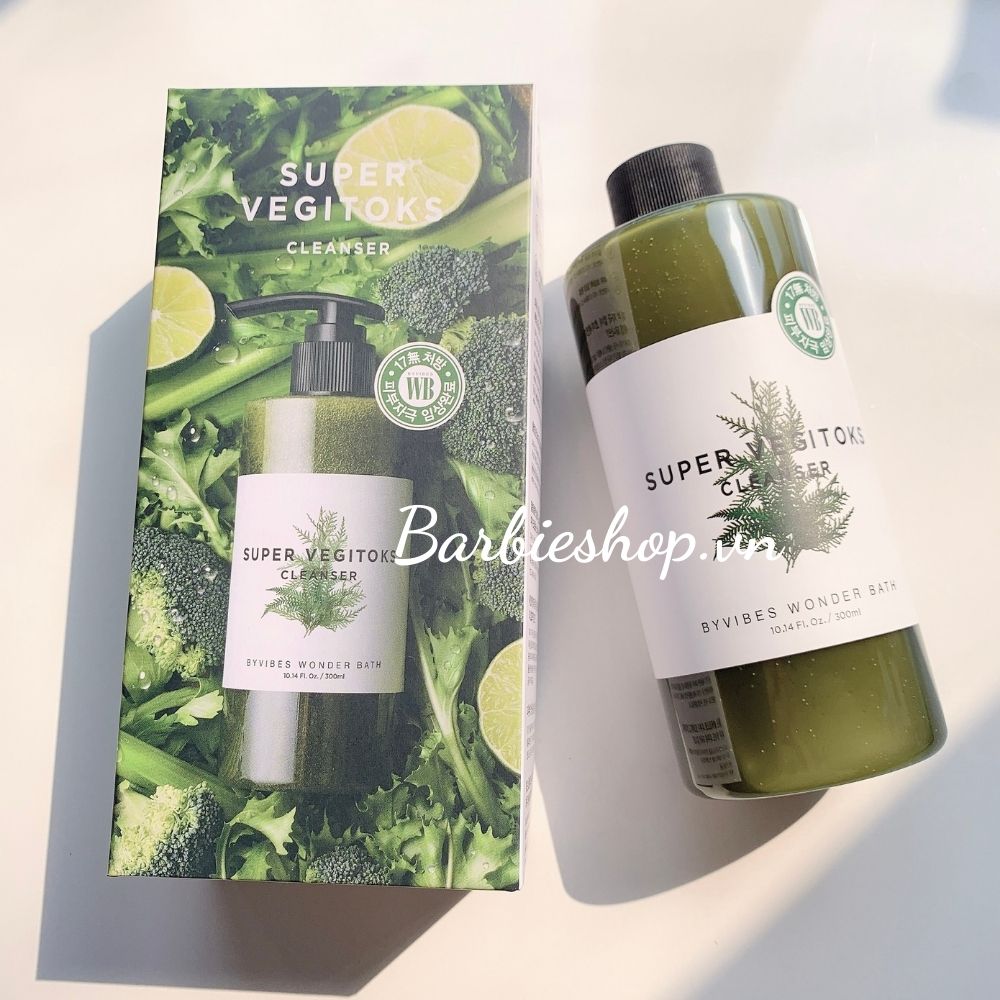 -Bao bì : Super Vegitoks Cleaner được thiết kế với chai dạng vòi phun màu xanh lá cây cực kỳ tươi mát và tiện lợi, chất liệu nhựa an toàn trong suốt đã làm nổi bật được texture màu xanh đậm như sinh tố của sữa rửa mặt. Dung tích 300ml