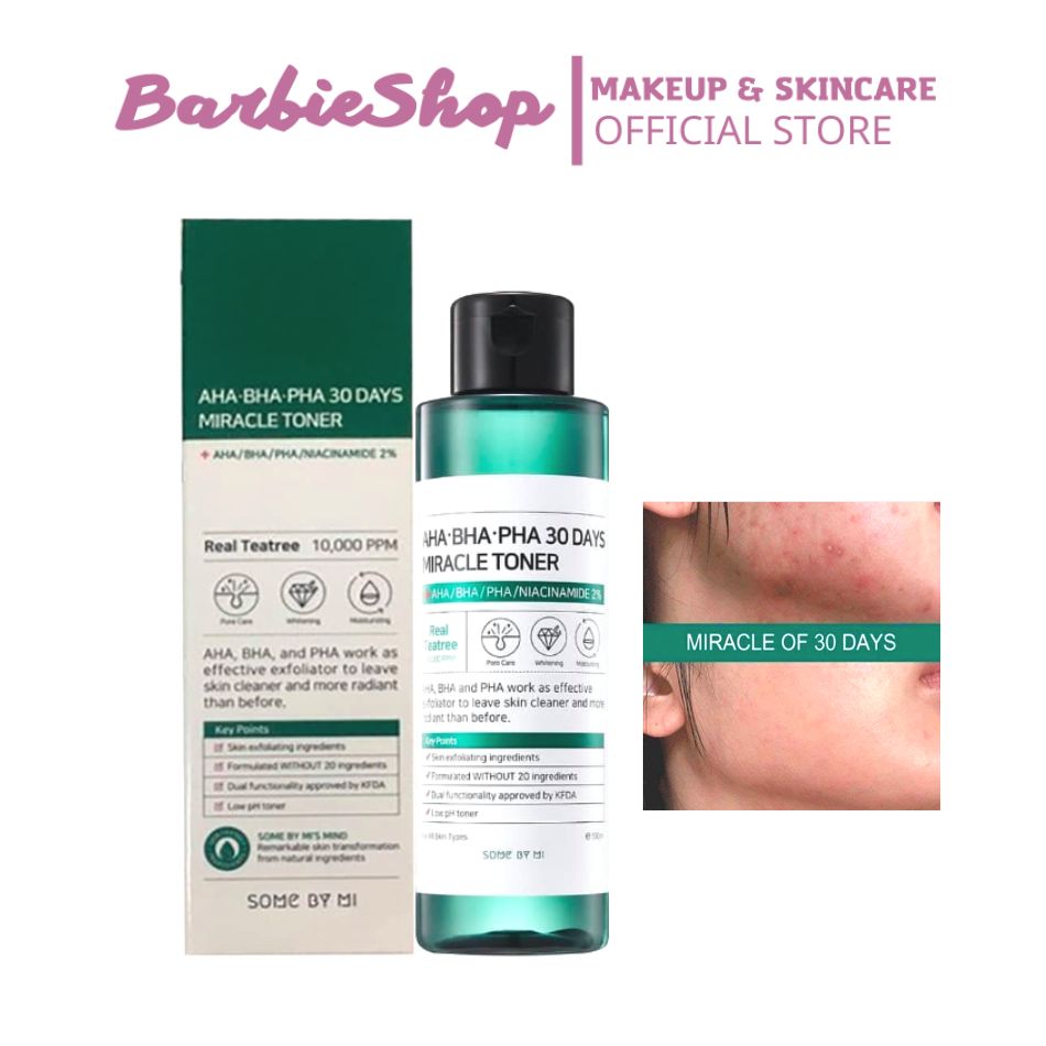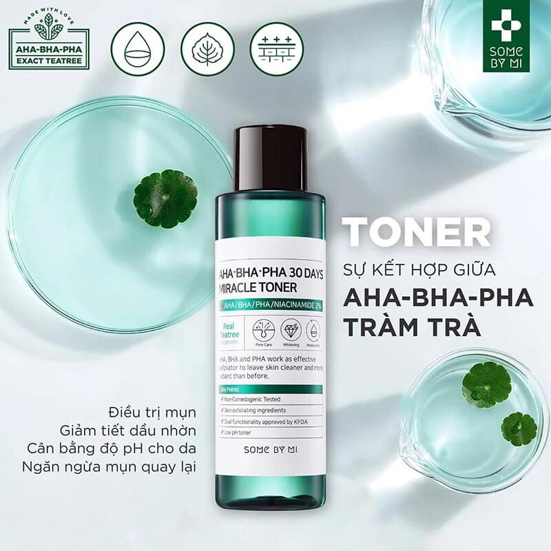 Nước Hoa Hồng Some By Mi AHA BHA PHA 30 Days Miracle Toner có khả năng “thay da” đầy thần kỳ với các thành phần đặc biệt chứa AHA (citric acid), BHA (salicylic acid), PHA (lactobionic acid), chiết xuất đu đủ đem lại khả năng làm sạch sâu trong lỗ chân lông hạn chế sự hình thành mụn đầu đen, mụn đầu trắng. Thêm vào đó trong thành phần sản phẩm còn có chứa chiết xuất dầu tràm trà, chiết xuất nước cây phỉ có khả năng thu nhỏ lỗ chân lông. Nhà sản xuất còn bổ sung thêm niacinamide có khả năng làm sáng da và hyaluronic acid, glycerin, urea để tăng khả năng dưỡng ẩm, làm dịu da.