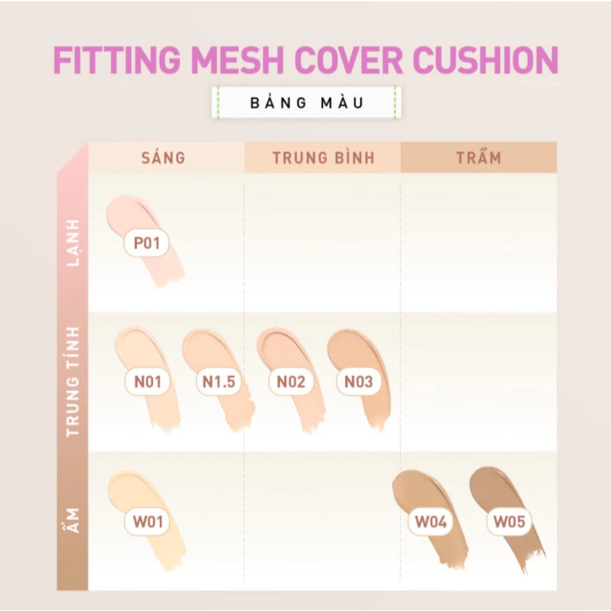 Phấn Nước Giúp Da Sáng Tự Nhiên Fitting Mesh Cover Cushion 11g. Tận hưởng làn da hoàn hảo như ngọc trai, rạng rỡ suốt cả ngày với kem nền cushion mới của 3CE. Được hỗ trợ bởi 3CE Super Pearl, hiệu ứng thích ứng ánh sáng thay đổi màu sắc độc đáo – từ vàng sang hồng, đến tím – làm sáng và hiệu chỉnh tông màu da của bạn để có hiệu ứng nâng tông cho vẻ ngoài tự nhiên rạng rỡ và khỏe mạnh.