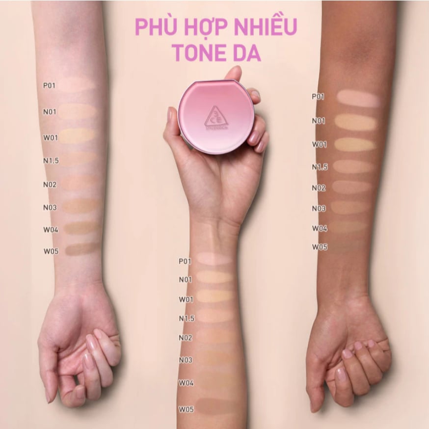 Hiệu ứng "làn da ngọc trai" rạng rỡ: Nhờ công nghệ 3CE Super Pearl (vàng – hồng – tím), cushion giúp nâng tông, làm sáng và đều màu da một cách tự nhiên.