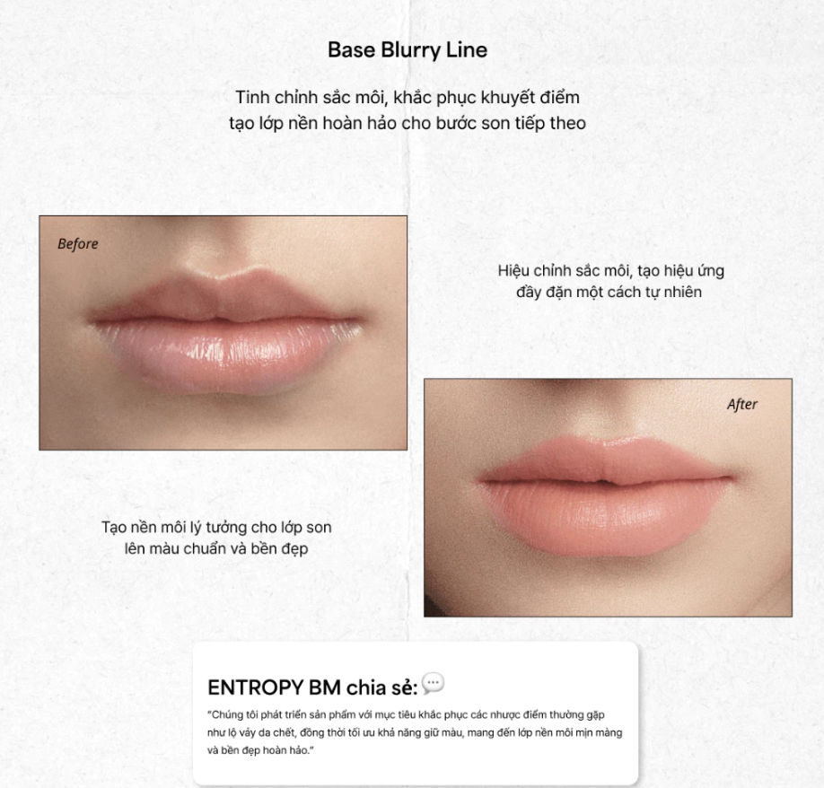 + Dùng Base Blurry tán nhẹ toàn môi làm nền.